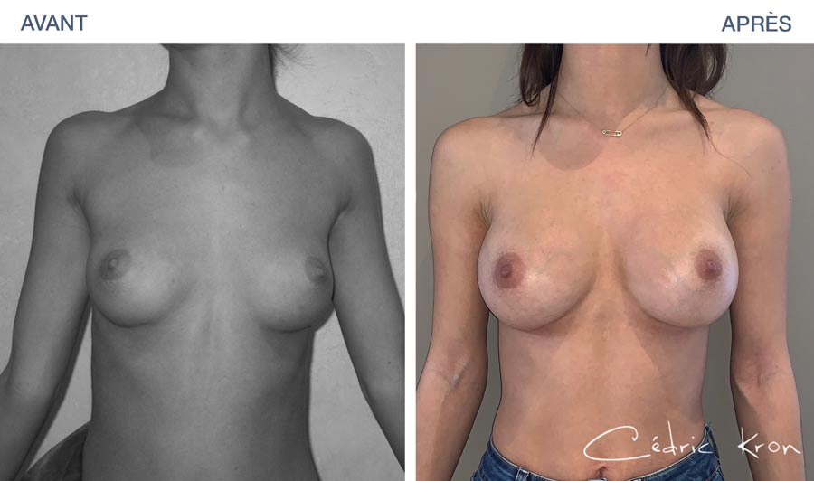 Photos avant-après d'une augmentation mammaire par prothéses (plastie pour hypoplasie mammaire). L'objectif de ce type d'intervention de chirurgie esthétique est d’embellir la forme et la taille d’une poitrine avec un résultat naturel.