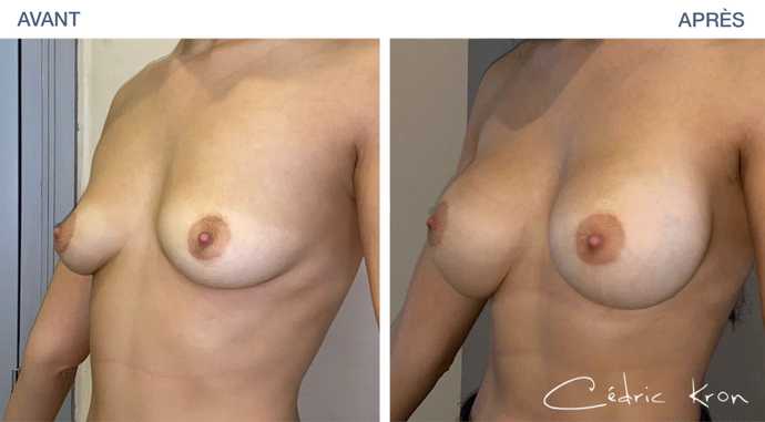 Photos avant-après d'une augmentation mammaire par prothéses (plastie pour hypoplasie mammaire). L'objectif de ce type d'intervention de chirurgie esthétique est d’embellir la forme et la taille d’une poitrine avec un résultat naturel.